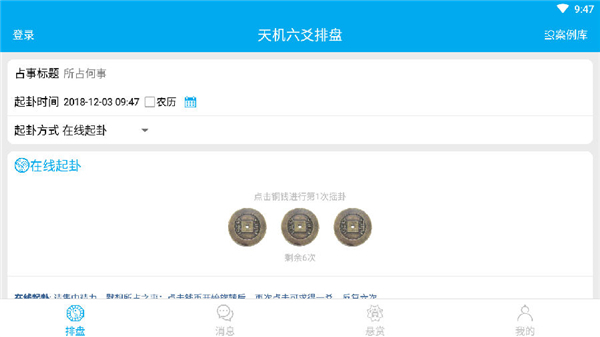 天机六爻排盘一共有两种起卦方法,一种是“按时间起卦法”,另一种是“按事情起卦法”。