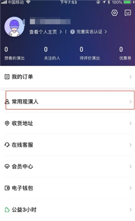 3. 第三步,在个人页面中,点击下方的常用观演人选项。