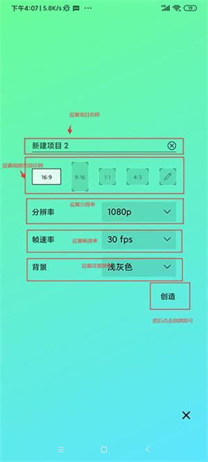 3、于项目设置界面,能够对项目名称、宽高比例、分辨率、帧速率以及背景颜色进行设置。这里面,宽高比例与分辨率需依据您的实际需求来挑选,像1:1适合Instagram这类社交媒体平台,16:9则适合YouTube等视频分享平台。帧速率关乎视频的流畅程度,通常建议选取30帧每秒。背景颜色可按您的需求选择透明或者其他颜色。
