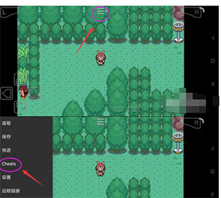 1、在手机上打开gba模拟器,运行游戏后,点击以下图标,选择Cheats。