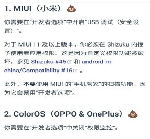 在安卓11及更高版本系统中,仅需按照步骤指南,通过无线调试即可启动Shizuku 。该步骤指南里,针对常见厂商的机型,提供了可能碰到问题的解决办法。