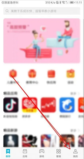 第一步:找到并点击应用市场。 第二步:待进入应用市场页面后,点击页面右下角的“我的”选项卡。