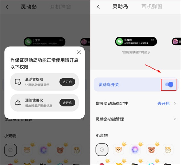 2、进入【灵动岛】设置页面,点击【灵动岛开关】并开启。需注意,为确保灵动岛功能能正常运行,用户需开启【悬浮窗权限】与【通知使用权】这两项权限。
