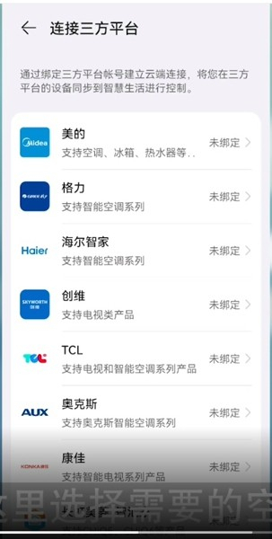 3、在这里选择需要的空调型号,然后绑定三方平台账号即可使用。