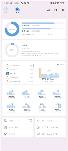 当进入首页后,我们能直观地查看各类手机数据,像手机的内存使用状况、系统进程、CPU占用率,以及各个核心的具体情况等。