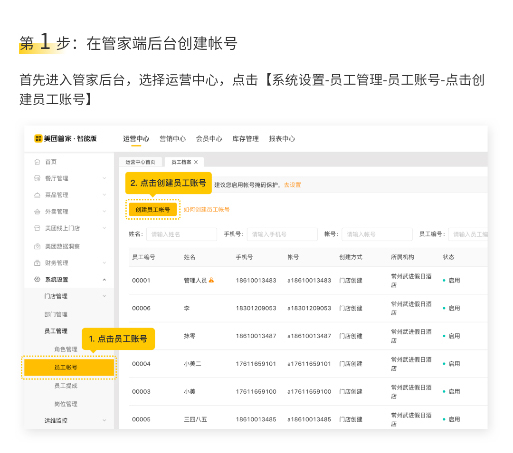 第1步:于管家端后台创建账号 首先,进入管家后台,选中运营中心,点击【系统设置 - 员工管理 - 员工账号 - 点击创建员工账号】。