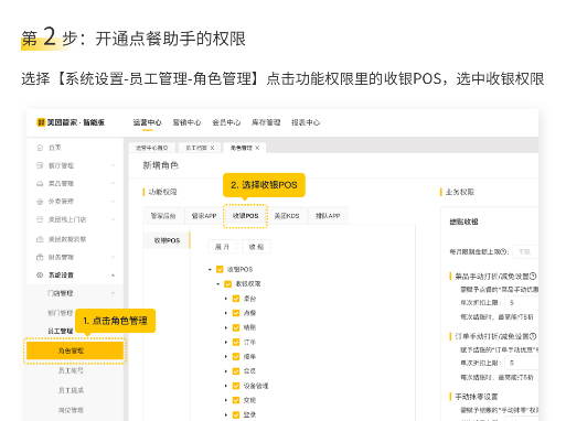 请在【系统设置 - 员工管理 - 角色管理】路径下,点击功能权限中的收银POS,进而选中收银权限。