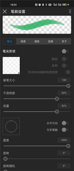 3、若想调整笔刷笔锋,可打开或关闭【笔尖形状】,其中的【圆度】【纹理设置】等同样会对笔刷笔锋产生影响,所有调整操作都在该界面完成。