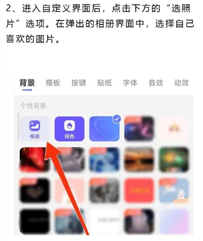 1、进入设置后,选择“自定义”选项,然后点击“选照片”进入相册选择图片。