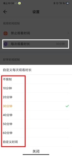 2、在此处,我们能够看到【每次观看时长】,点击它之后,便能选择自定义每次的观看时间。