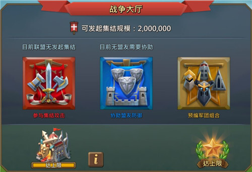 如果你是盟里的集结手或主战人员,就必须升级战争大厅,这是你发起集结的数量,当战争大厅25级可以增援参与集结200W兵。升级战争大厅需要战典道具,除了水晶买以外,还能开联盟礼包箱子获得。