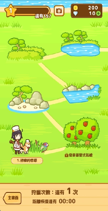 1、狩猎机制:每小时恢复1点狩猎点数,选择不同狩猎地点(如清水河、山猪山)捕捉动物。优先升级狩猎技能至10星,提升肉量产出。