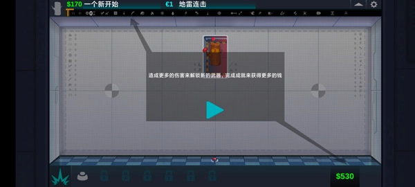 5、通过造成更多的伤害来解锁更多的武器,完成更多的成就来获取更多的钱。